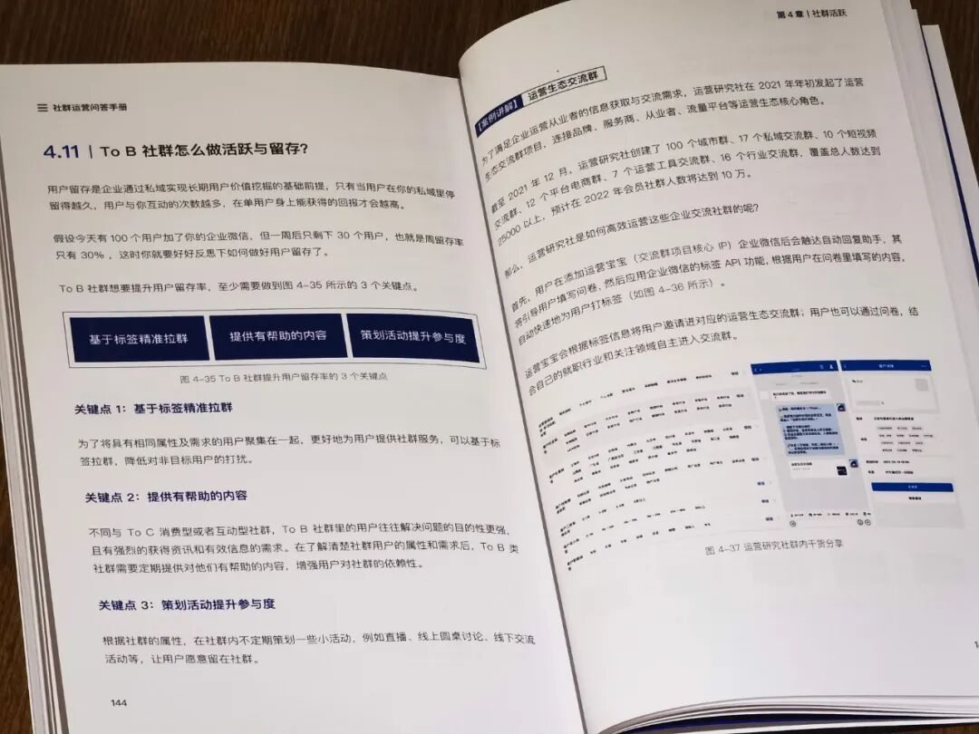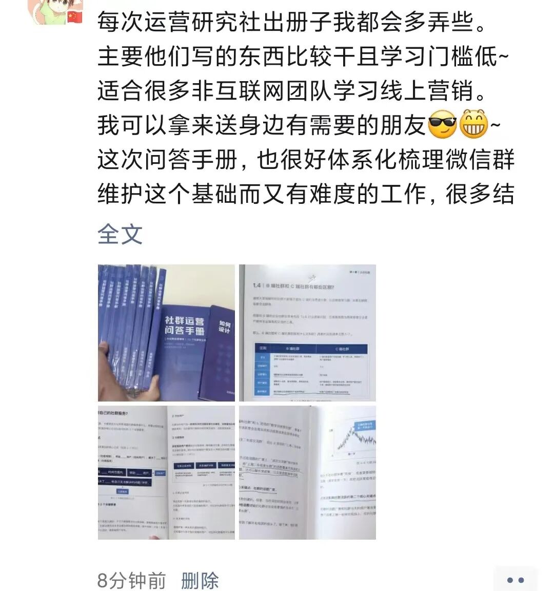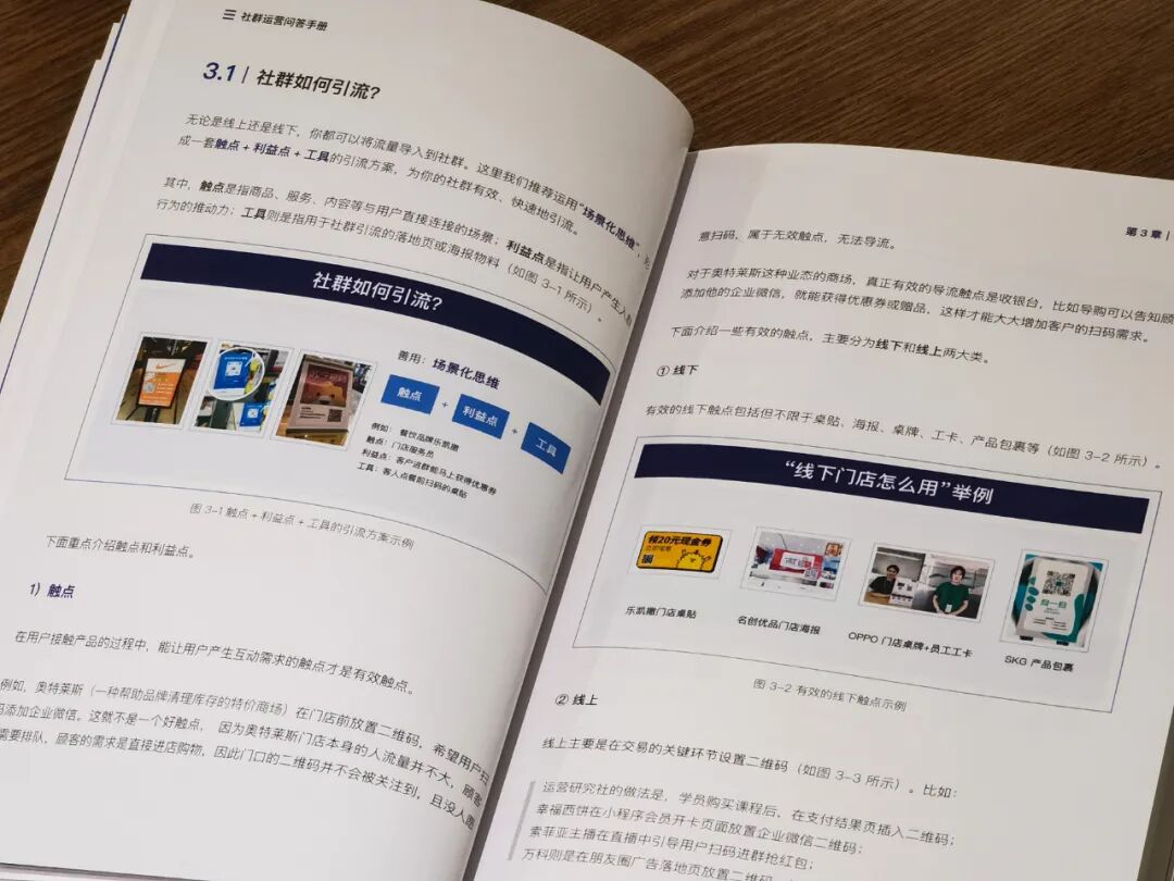 同时,他的授课风格非常坦诚,且回答往往一针见血,直击本质,你可以点击他在企业微信举办的数字化增长训练营里的回答感受下。最后,是案例的辅助讲解,在选取案例时,我们会选择当下比较典型的、比较新的案例,希望通过案例的讲述,让伙伴们更好地理解内容,降低操作难度,提升案例的可复用性。该手册为付费图文自学课程,课程购买后可无限回看;购买课程后可关注“运营研究社服务号”,在菜单栏点击 “个人提升 - 我的课程 - 我的已购” 进行学习。课程售价 69 元, 现在购买还有额外福利——免费包邮送 《社群运营问答手册》课程图文纸质版 1 份。支付成功后,请根据自动弹出的二维码添加「运营宝宝」企业微信,根据提示填写地址收集表即可领取纸质版手册。另外,该课程为虚拟内容产品,购买成功后不支持退款,大家可以思考清楚再做决定。