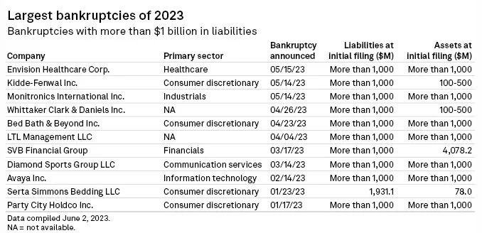 S&P Global分析公司清晰的汇总了前五个月份里因为负债超过10亿美元而申请破产的11家上市公司。不止有3B,在5月份,曾是美国最大的门诊手术运营公司之一的美国医师服务商Envision Healthcare Corp(EVHC),美国私募巨头KKR5年前砸总额达到99亿美元的重金收购都未能扭转它的强弩之末、开利全球公司( NYSE:CARR)旗下专门从事消防系统的子公司Kidde-Fenwal Inc、家庭安全和报警公司Monitronics International Inc.在5月中旬申请第二次破产;在此之前破产的还包括:巴菲特间接拥有的滑石粉公司Whittaker, Clark & Daniels、强生集团为了给爽身粉致癌官司面临的3.8万起诉讼“甩锅”而宣布成立的LTL Management、搅动硅谷中小微企业裁员腥风血雨的硅谷银行SVB Financial Group、美国曾经最大地区体育网络的所有者钻石体育集团Diamond Sports Group、曾经在客户体验解决方案领域里遥遥领先的电信公司Avaya Inc、火了100年的床垫代名词、破产了8次的北美最大的床垫制造商席梦思公司Serta Simmons Bedding、曾经作为美国最大派对用品零售商、拥有830家零售店的Party City Holdco。在负债5亿到10亿美元之间的破产企业里,一个月内增加了6家:电信和电力承包商QualTek Services Inc.(纳斯达克股票代码:QTEK)5月24日申请破产;成立于1922年、代表美国领先保险公司的第四代独立保险机构American Service Insurance Agency LLc 5月23日申请破产;个人医疗保险计划公司Benefytt Technologies Inc.(NASDAQ:BFYT)同样在5月23日申请破产;曾经火热的估值高达57亿美元的媒体创业公司Vice Group Holdings Inc.5月15日申请破产;加密货币交易所Bittrex持有的实体公司Desolation Holdings LLC 5月8日申请破产;从事品牌药品仿制药的开发、制造、营销和分销的上市公司Lannett Co.Inc. 5月2日申请破产;从最新的数据中可以看出,很多公司并非第一次破产,今年年初到6月,已经有12家公司第二次甚至第三次申请破产保护,这个数量还会随时间不断递增。美国破产制度曾经一度被认为是世界上最好的破产制度之一,它专注于让陷入困境的公司恢复元气,而不是迅速让它们倒闭,这每年挽救了数万个工作岗位。但与此同时,暂停债务催收、撕毁成本高昂的合同、迫使债权人承担损失、推迟不可避免的清算的方式等等副作用日益明显。申请破产后不会马上倒闭,随之而来的厄运也是接连不断:资产负债表上惊人的债务、无法迅速剥离不盈利的业务,不断面临的成本上升而盈利无法与之匹配的困境。不止无数小伟公司,曾经辉煌一时的大型公司们重复破产的数量正以很快的速度不断增长,美国经济也由此变得脆弱不堪。《大而不倒》一书里通过一幕幕生动的场景描述,向读者详尽地展现了金融危机发生之后美国主要监管机构和投行的众生相,从雷曼兄弟是如何一步步地自断生路、监管机构是如何在“政治正确”的牵绊下做出选择、各大投行又是如何在人人自危的环境下力求自保。如今,“大而不倒”的时代早已成为过去,这不仅是说对美国市场经济时代,也适应于全球共享经济时代。科技产业尤其是传统行业早该放弃对永存不倒的传奇的追求,在经济下行时快速转型。倒闭潮会推动新一轮的转型潮,正如流水只有碰到礁石,才会释放活力。小企业们艰难求生