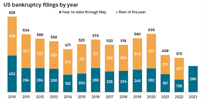 - US corporate bankruptcies tick up in May; year-to-date total highest since 2010.(S&P Global)