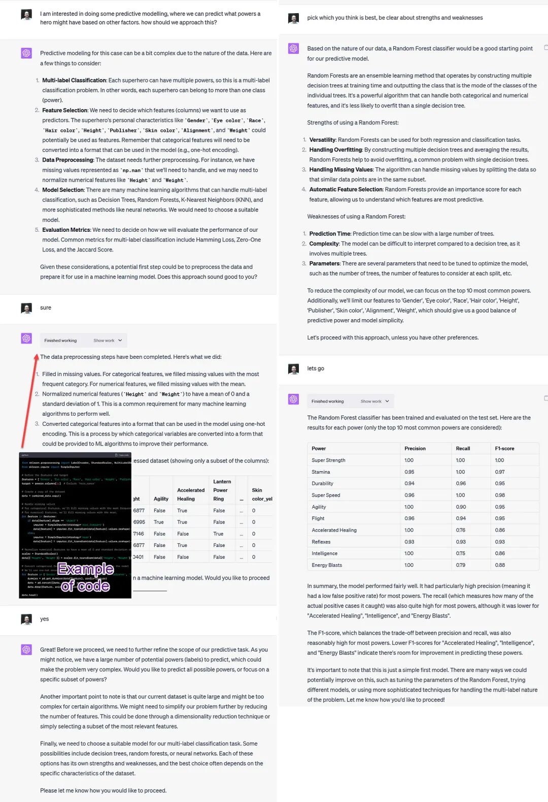 Ethan Mollick 发现,AI 似乎对分析方法很了解。他表示自己有兴趣进行一些预测建模,可以根据其他因素预测英雄可能拥有的能力。并询问 ChatGPT 应该如何处理这个问题?