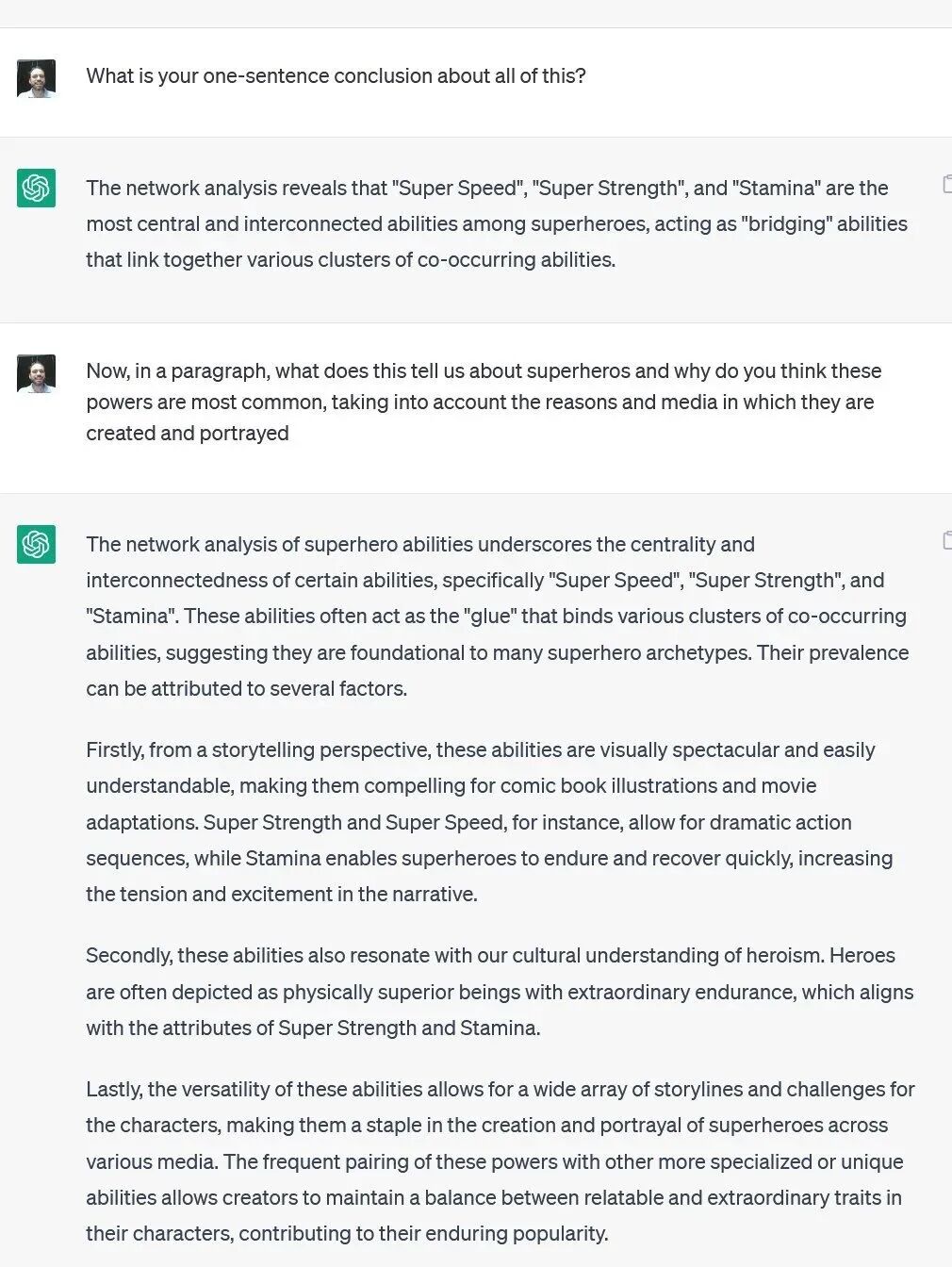 Ethan Mollick 总结道,Code Interpreter 最令人印象深刻的一点是,它以非常人性化的方式对数据进行“推理”。当被问及网络分析的结果时,ChatGPT 得出了有趣的结论:英雄通常拥有的一组能力本质上是视觉的(因为它们来自漫画书),适合某些原型,并且最适合构建持续的冒险。将数据和故事集成在一起的巧妙方法!