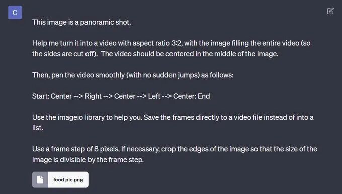 三是告诉 ChatGPT 你的需求,如:从左到右为这张食物图像制作动画;