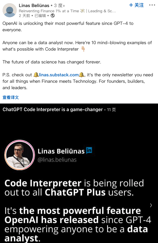 乃至知名金融公司 Flutterwave 的欧洲国家经理兼立陶宛总经理 Linas Beliūnas 在其 LinkedIn 也发表评论表示,“OpenAI 正在向所有人解锁自 GPT-4 以来最强大的功能。现在任何人都可以成为数据分析师。”