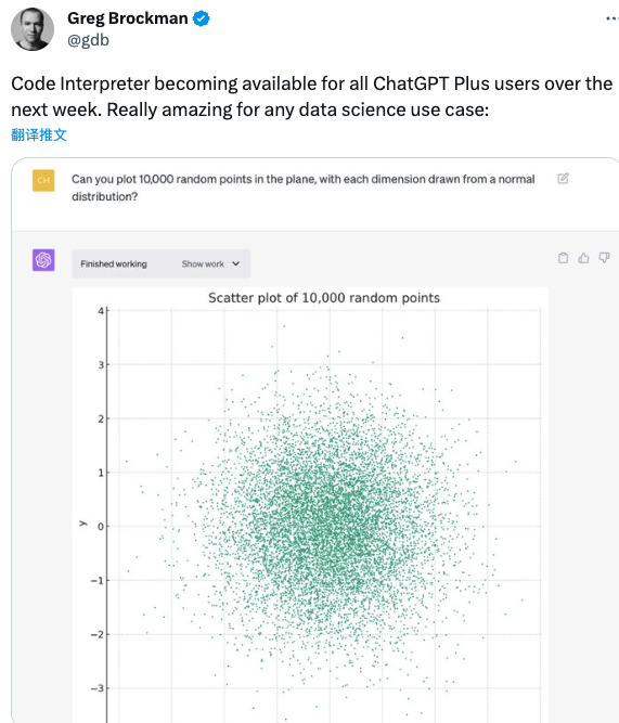 像 OpenAI 联合创始人 Greg Brockman 演示的这样,只需要轻轻问一声,“你能在平面上画出 10,000 个随机点吗?每个维度都是正态分布”,ChatGPT 就给出了这样的结果:
