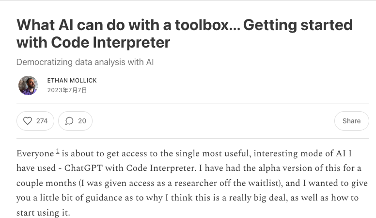 来自沃顿商学院教授 Ethan Mollick 写了一篇详细的指南,并以代码解释器处理数据为例,深入分享了整个上手经过与体验心得。