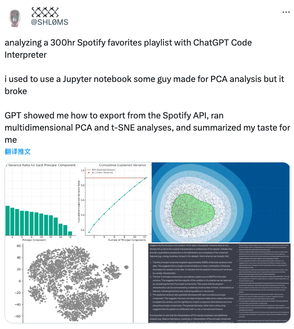 还有用户使用 ChatGPT 代码解释器分析 300 小时 Spotify 收藏夹播放列表。最终,GPT 向其展示了如何从 Spotify API 导出,运行多维 PCA 和 t-SNE 分析,并为他总结了自己的品味:
