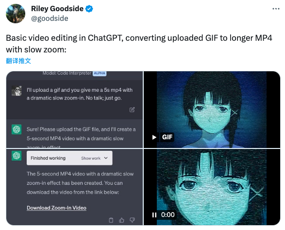 上传一个 GIF 图片,ChatGPT 能生成一个 MP4 视频文件回来!