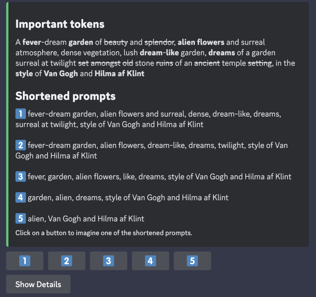 描述的越详细,生成的图像效果可能就会越好。当然,如果你使用的提示词太多,便会产生过度冗长,反而使生成的图像效果打折,无法输出与你想象一致的图像,对此,Midjourney 的方法是使用“-shorten”命令来解决冗长的提示词,并且还为用户提供了几个替代方案。