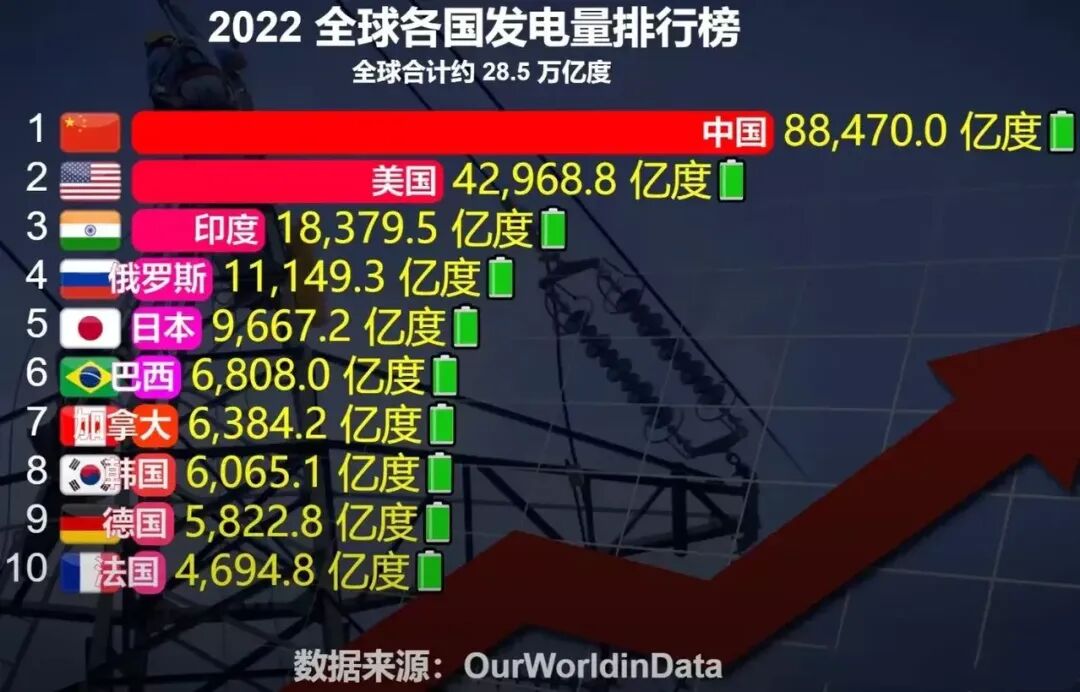 欧洲电费都已经到了负数价格,难不成是说欧洲的电力资源太多了吗?从上图可以看得出来,如果和中美相比较的话,欧洲国家的电力资源其实也并不算太多,德国整个2022年的发电量才5822.8亿度,从法国开始往下面计算,去年发电量都还不到5000亿度。