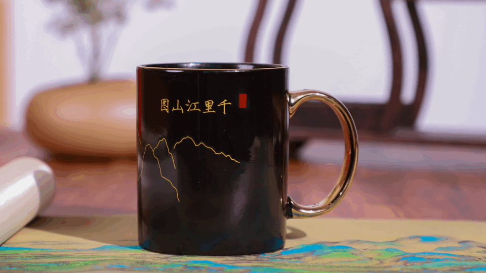 《千里江山图》感温变色杯遇热时,杯身上的千里江山图案会“全景打开”,让你瞬间感受到千年名画的美妙与魅力。