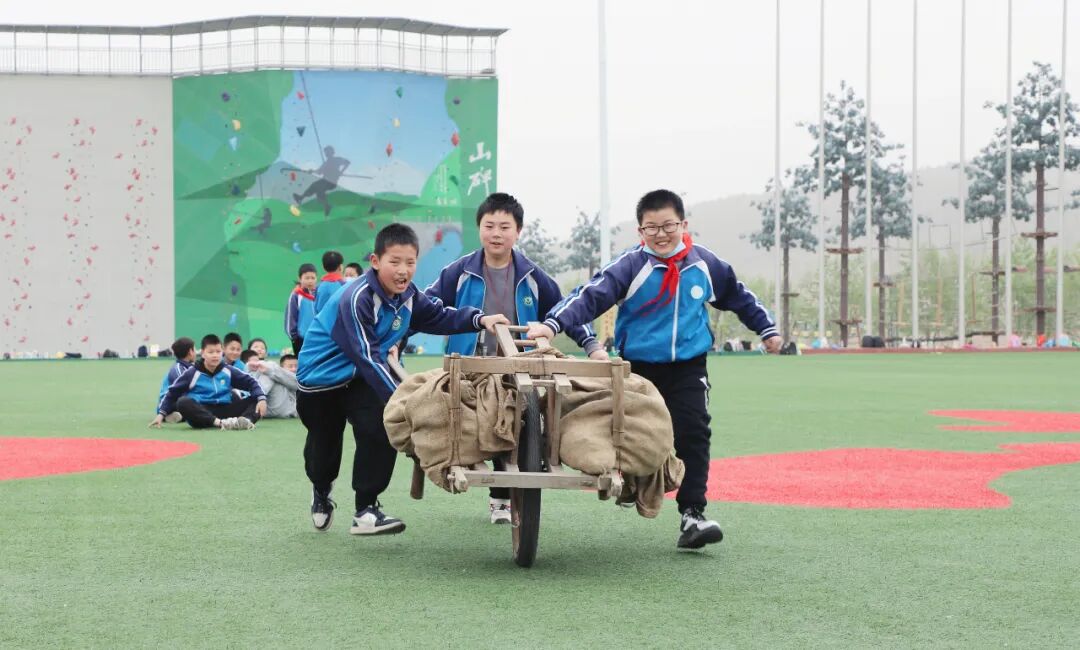 营地还将红色教育与劳动教育相融合,让学生在营地可以推一把独轮车,车上左右两侧各有一个沉重的麻袋,需要一个人扶稳车把,两个人侧扶,3个人互相配合才能完成往返路程的运送任务。