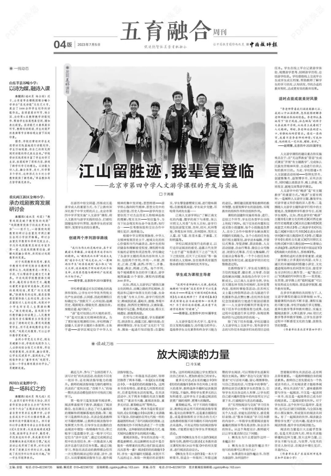 在研学旅行中,教师带领学生追寻古人足迹,寻访历史文化的遗踪。“当原本在教材上通过文字感知的景色和历史场景呈现在学生面前时,他们对课文的理解也会更加深入。”校长王艳军说。