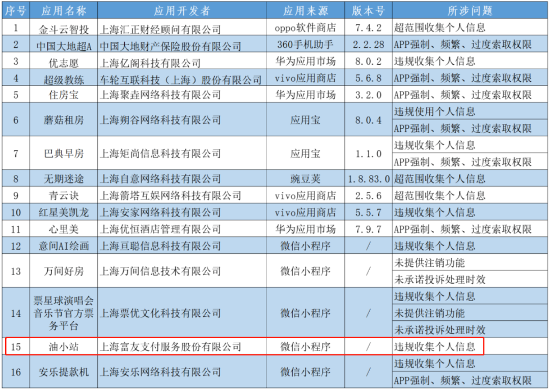 其中包含一家支付机构的应用,为上海富友支付服务股份有限公司旗下的油小站微信小程序,所涉问题为“违规收集个人信息”。