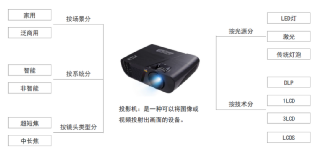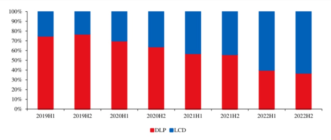 图:投影仪分类 目前,DLP技术的成像效果整体要强于LCD技术。但同时,由于DMD芯片成本较高,国产化率低,导致DLP技术路线的成本也要高于LCD。因此,采用DLP技术的家用投影仪一般为2000元以上的中高端产品,而采用1LCD技术的投影仪则多为千元档的低端产品。此前,受消费升级的助推,国内主流的品牌家用投影仪厂商基本都采取的是LED/激光+DLP的路线。也正因为此,DLP路线一度是市场的绝对主流。根据洛图科技数据,2019年采用DLP路线的投影仪在整体投影仪中的占比高达75%。但疫情对消费的冲击改变了这一趋势。从2020年开始,搭载1LCD技术的投影仪便开始一路攻城略地,并在2022年反超DLP成为市场的主流技术路线,2023年Q1 LCD的市场份额更是达到了65%。