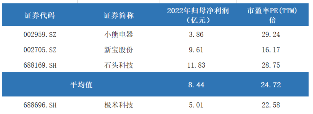 图:极米科技估值对比 其次,我们选取报告期内营收和盈利接近的网红小家电品牌小熊电器、石头科技和新宝股份作为可比公司,目前三家公司2022年的平均归母净利润为8亿元,平均PE(TTM)25倍。
