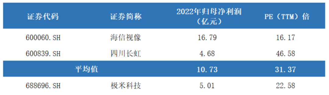 最后,我们选取拥有智能微投业务的上市企业光峰科技作为可比公司,2022年光峰科技的归母净利润为1.2亿,PE(TTM)为83倍,在盈利不及极米的情况下估值却远高于极米。