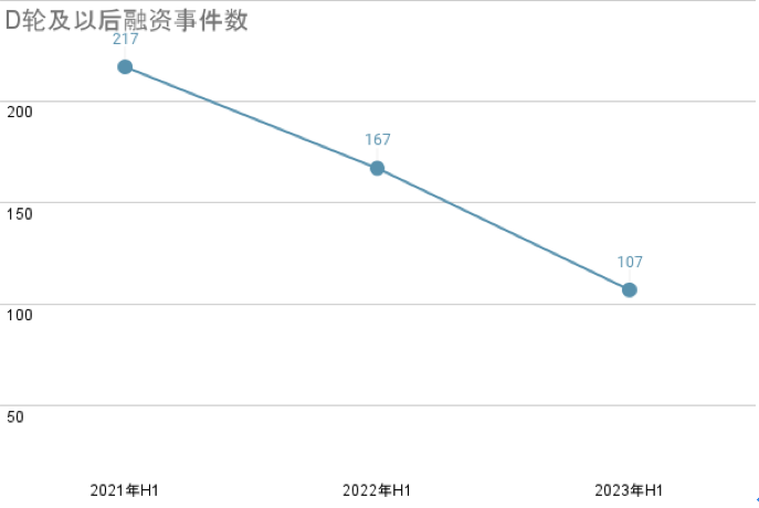 根据CVSource投中数据,2023年截至6月底的D轮及以后轮次的融资事件次数是107次,而2022年同期是167次,2021年上半年更是高达217次。两年腰斩,后期融资形势显而易见的严峻。