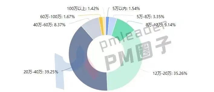 还有大家最关注的薪资,这是2022年PM圈子统计的项目经理年薪收入区间分布,(城市为一线城市偏多)年薪集中分布在20万-40万之间,通过数据可以看出来,项目经理下线低,但是上线也很高,年薪百万的也有。