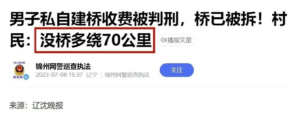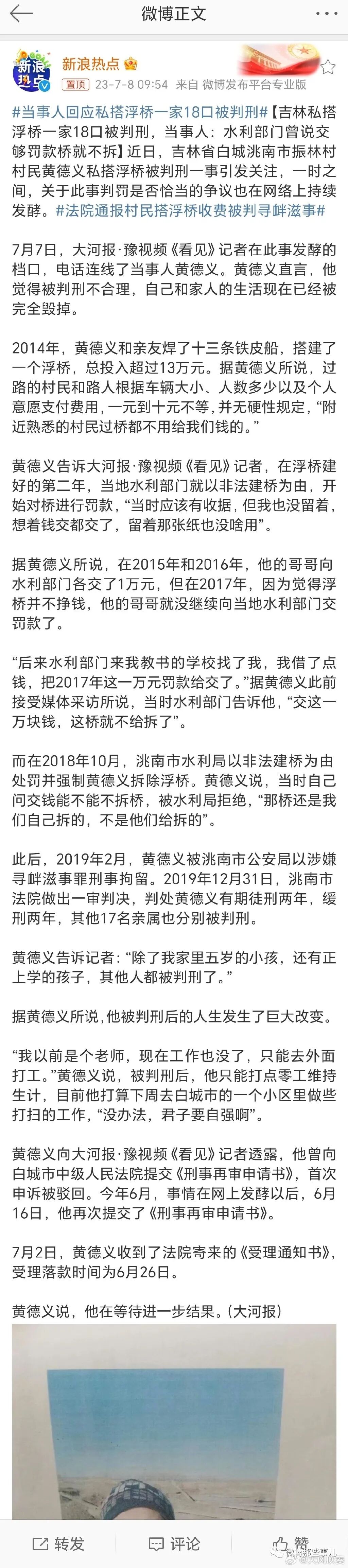 近日,吉林洮南市村民黄德义私搭浮桥收费被判刑,引起热议。