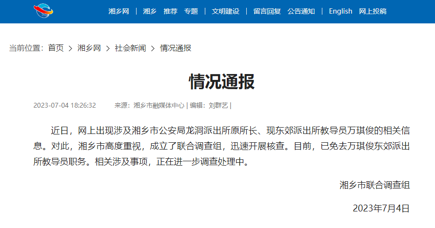 另据湘乡网4日消息,湘乡市联合调查组发布情况通报:近日,网上出现涉及湘乡市公安局龙洞派出所原所长、现东郊派出所教导员万琪俊的相关信息。对此,湘乡市高度重视,成立了联合调查组,迅速开展核查。目前,已免去万琪俊东郊派出所教导员职务。相关涉及事项,正在进一步调查处理中。