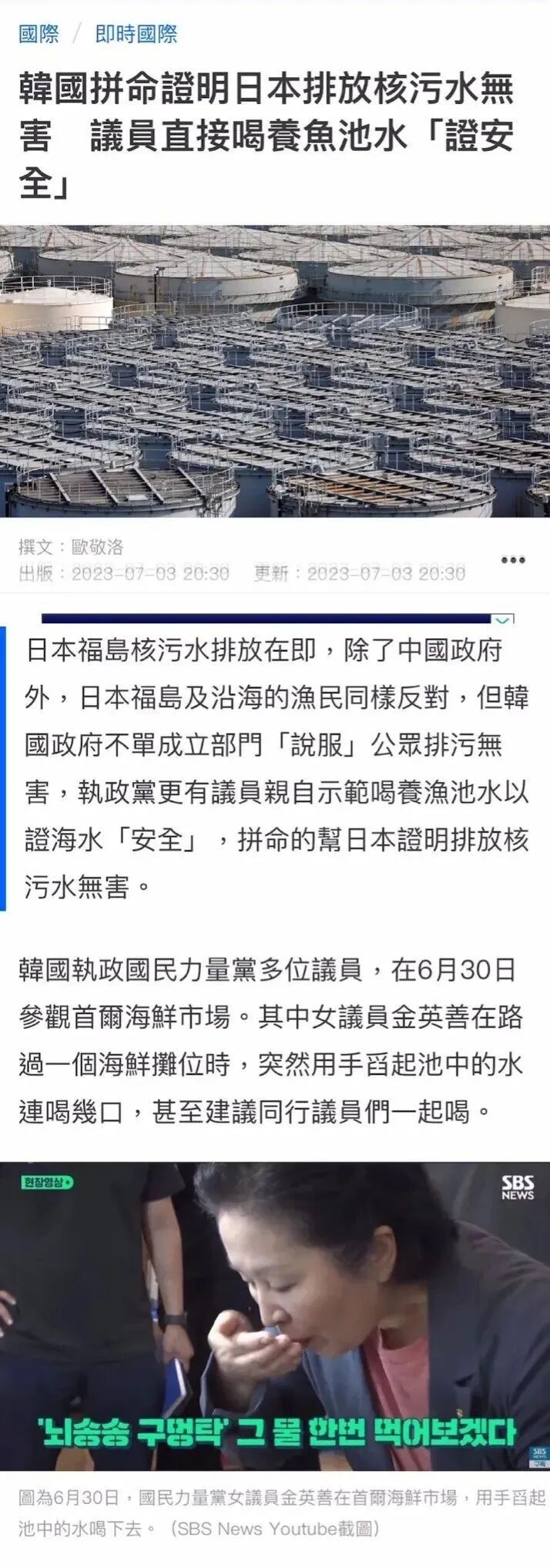相比之下,韩国尹锡悦政府为了日本解封高科技材料,选择完全跪了…不但宣传核废水无害,议员金英善为证明日本核污染水无害,亲自喝养鱼池里的水…韩国反对党表示,“连鱼池里的鱼也觉得荒唐”…