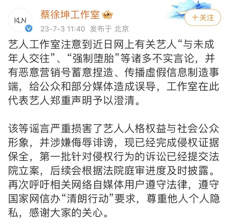 稍后,@蔡徐坤工作室 也发布声明,称对于网传谣言已经完成侵权证据保全,第一批针对侵权行为的诉讼已经提交法院立案。