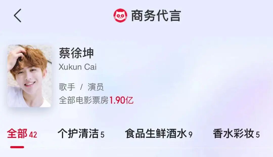 猫眼专业版显示,蔡徐坤共有涉及多个领域的42个商务代言,包括百事可乐、燕京啤酒、雀巢咖啡、安慕希、Prada、欧莱雅、屈臣氏、宝格丽、惠普、Levis、VIVO、施华蔻、立白、汰渍、维达等品牌。
