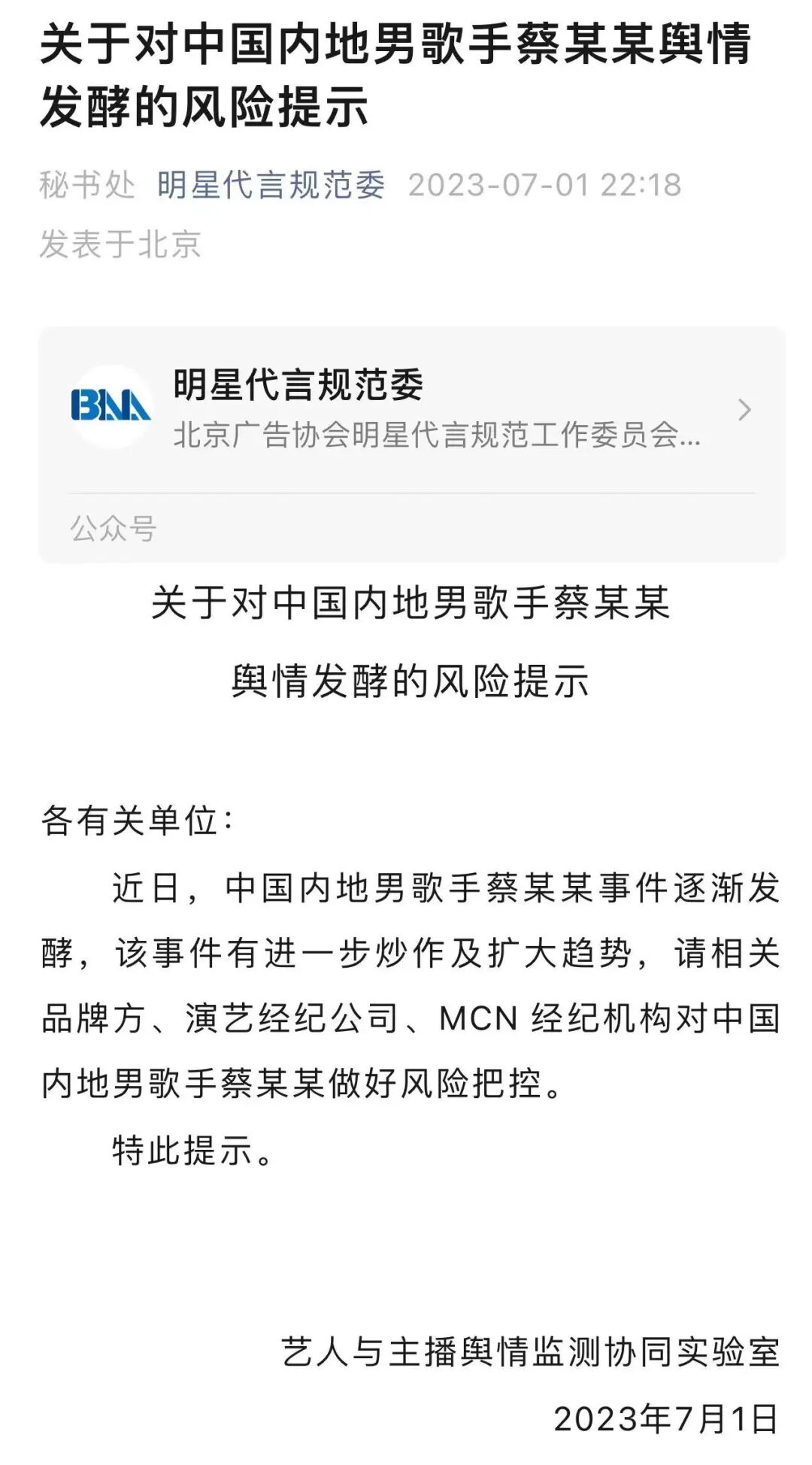 7月2日,北京广告协会明星代言规范工作委员会公众号发布艺人与主播舆情监测协同实验室7月1日发布风险提示称,近日,中国内地男歌手蔡某某事件逐渐发酵,该事件有进一步炒作及扩大趋势,请相关品牌方、演艺经纪公司、MCN 经纪机构对中国内地男歌手蔡某某做好风险把控。