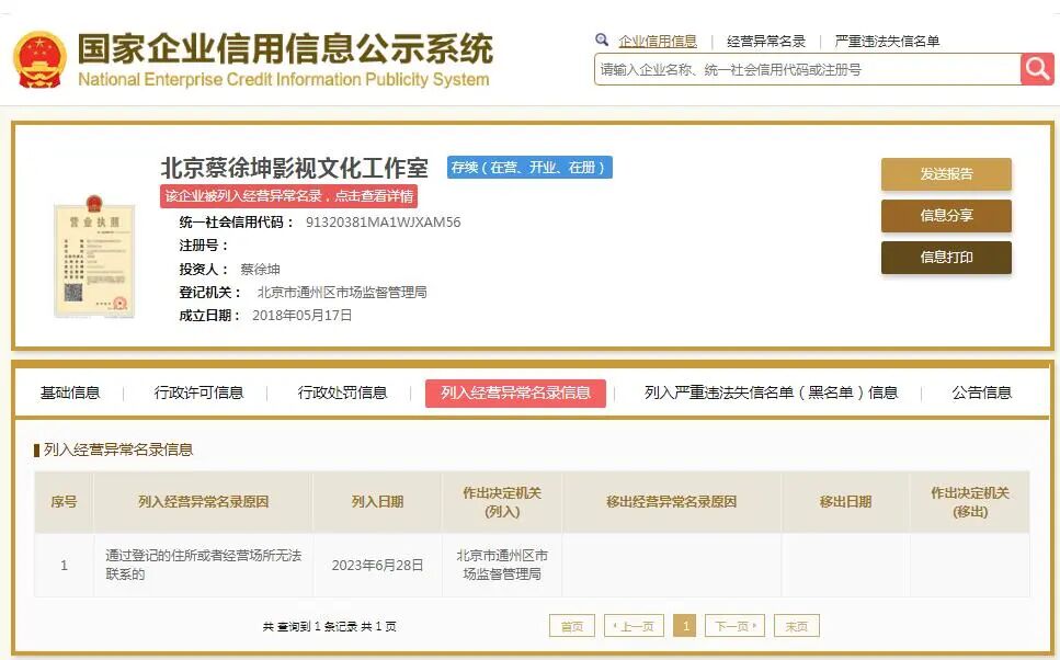 国家企业信用信息公示系统网站显示,6月28日,北京蔡徐坤影视文化工作室,因通过登记的住所或者经营场所无法联系,被北京市通州区市场监督管理局列入经营异常名录。