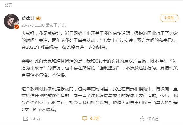 7月3日,蔡徐坤发布微博回应并道歉。蔡徐坤称,和C女士的交往均属双方自愿,既不存在“女方为未成年”的情况,也不存在所谓的“强制堕胎”。