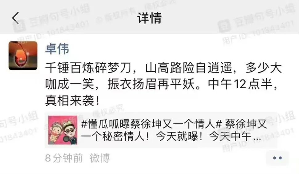狗仔预告了三天,今天卓伟还发朋友圈预告了蔡徐坤另外一个情人,说12点半就发。