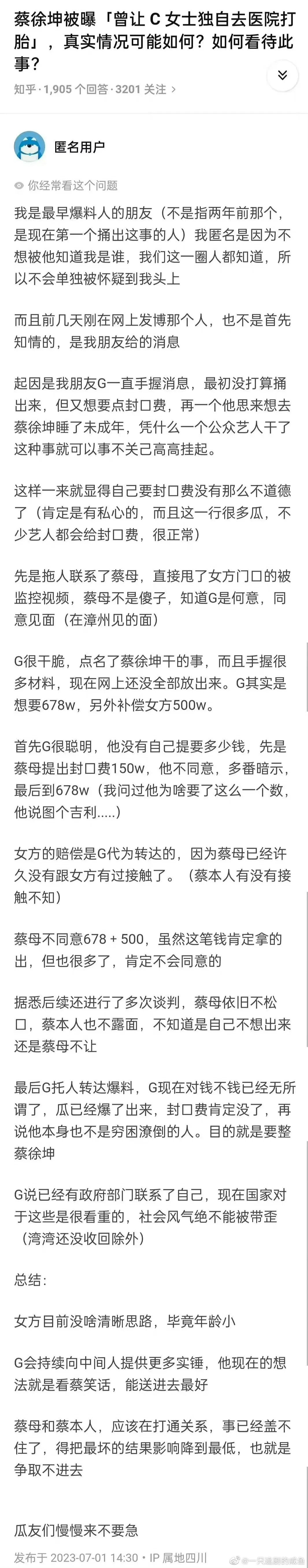 知乎上有人说自己是爆料狗仔的朋友,狗仔1号都还在和蔡徐坤谈价格,谈好了就不会再锤他,谈不好那就……所以,现在是谈好了吧?