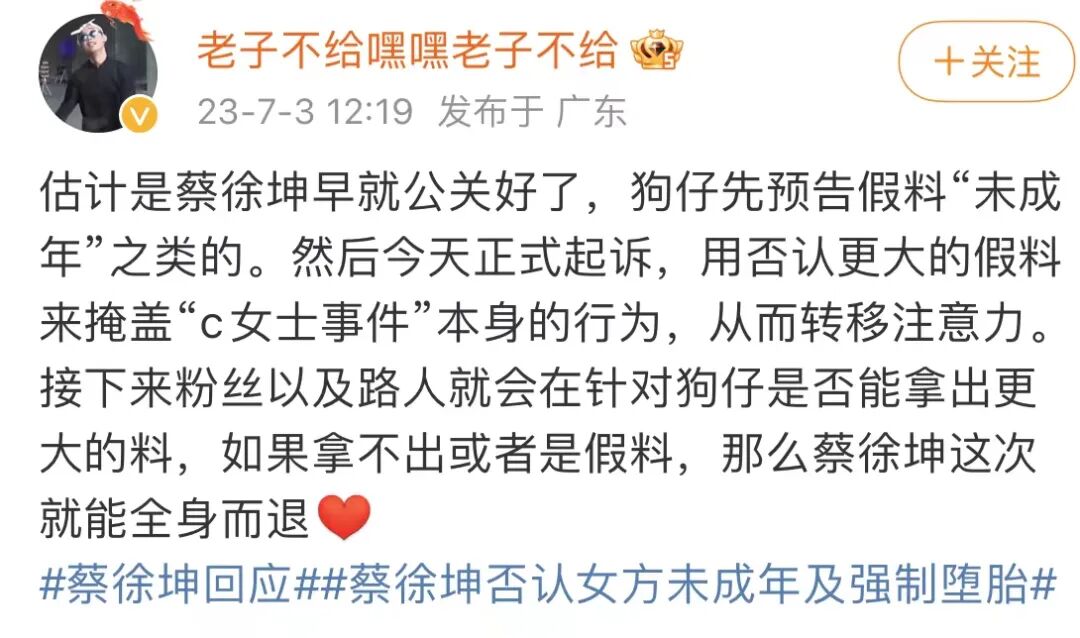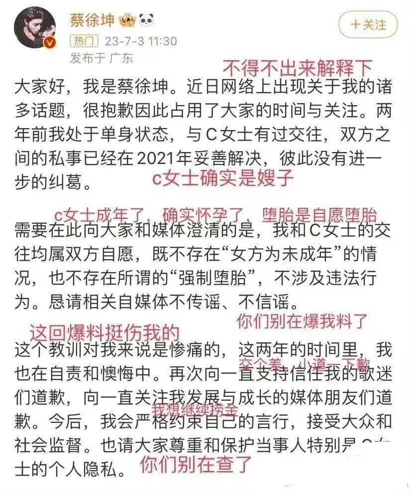 憋了快10天,但蔡徐坤偏偏要抢先狗仔40分钟回应,承认了恋爱,承认了打胎,其他全部否认。