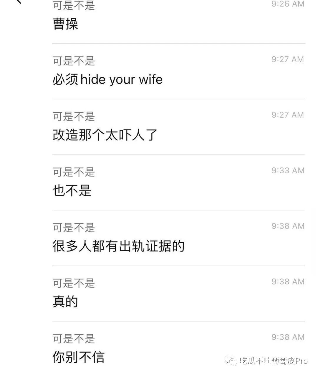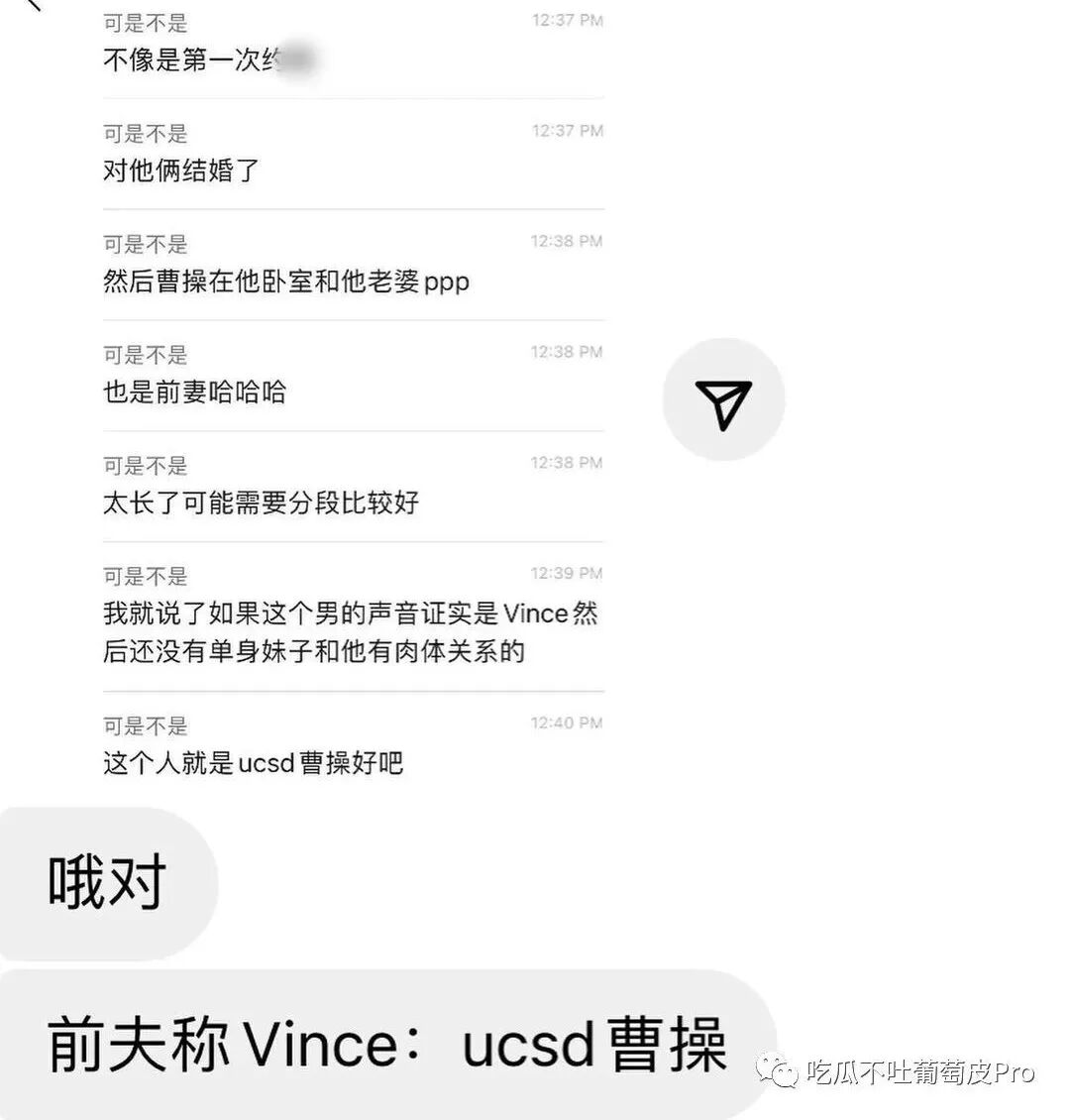 UCSD女博士的瓜可以拍一部电视连续剧了,女博士的前夫爆料Vince专门与人妻或孕妇连接,每次连接的时候都要👊一下,还给Vince起了外号叫曹操,笑我死了。(点击回顾)
