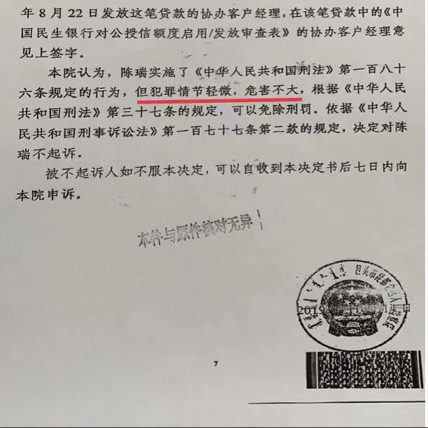 包头市昆都仑区检察院于2019年11月作出不起诉决定,认为陈瑞实施了《刑法》第186条规定的行为(即“违反国家规定发放贷款”),但犯罪事实轻微,危害不大,决定对其不予起诉。