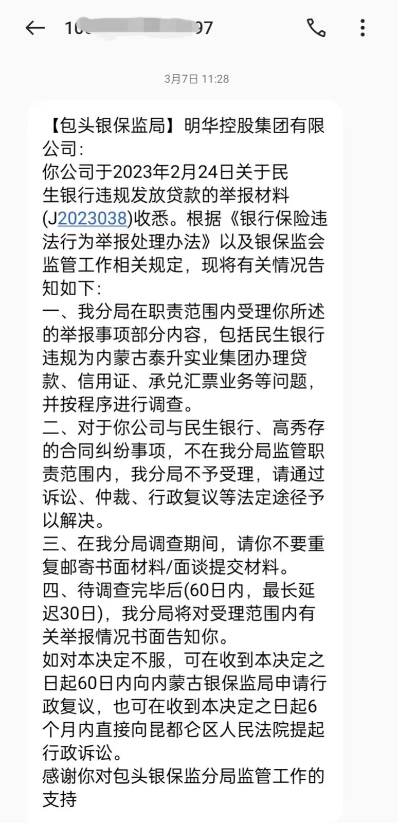 2023年4月28日,包头银保监局曾向反映人明华公司短信回复称,由于情况复杂,不能在60日内办结,需延长办理期限30日,调查完毕后将书面告知。