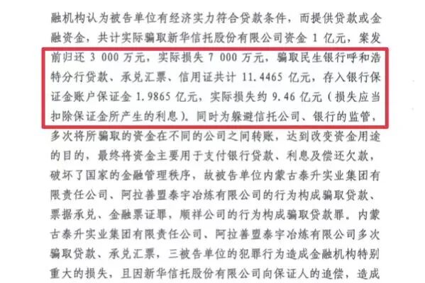 据悉,泰升公司及其子公司、公司董事长高秀存等已被追究刑事责任。内蒙古自治区鄂尔多斯市中级法院所作判决显示,2013年至2014年,泰升公司及其子公司骗取民生银行呼市分行贷款、承兑汇票、信用证共计11.4465亿元,造成实际损失约9.46亿元。
