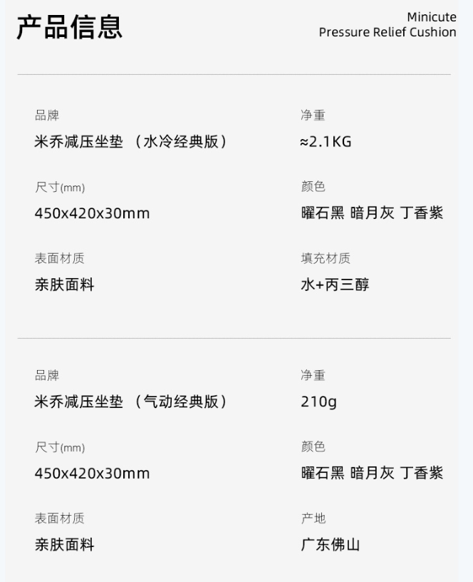 这两款,除了一个充水(冰凉舒适),一个充气(四季皆宜)外,其他基本都是一样的。