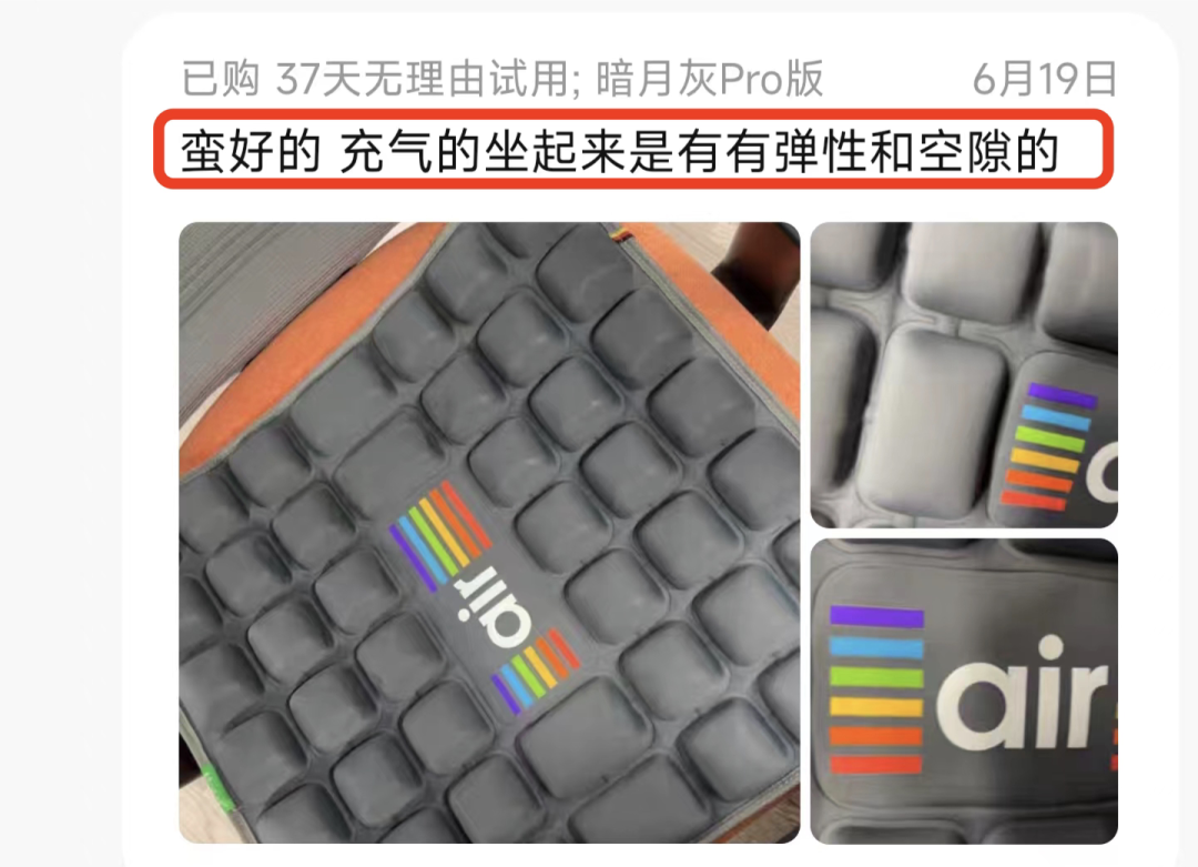 这是由于当气囊受挤压时,气体间相互流动,产生均匀加压的“反重力效果”,可缓冲垂直压力,大大减轻入座时尾椎的负荷和压力。