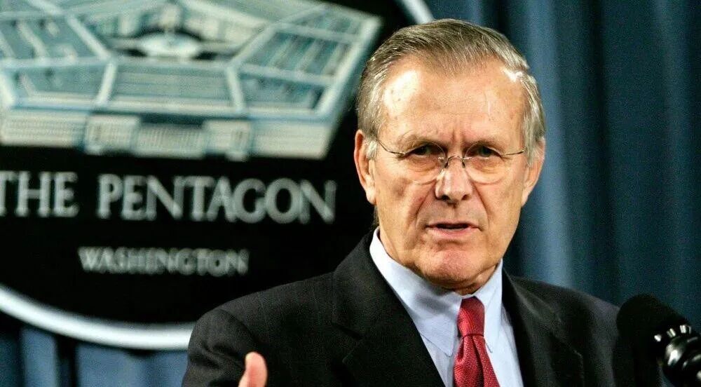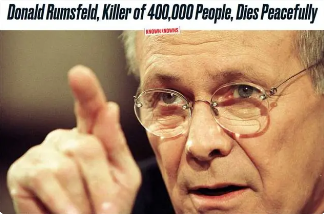 看到这里,有小伙伴可能要问了:难道美国人之前认为,战争不需要工业?拉姆斯菲尔德,美国前国防部长,2021年已经去世了。2021年拉姆斯菲尔德去世后,美国《野兽日报》称“这个害死40万人的凶手平静地死去了”。