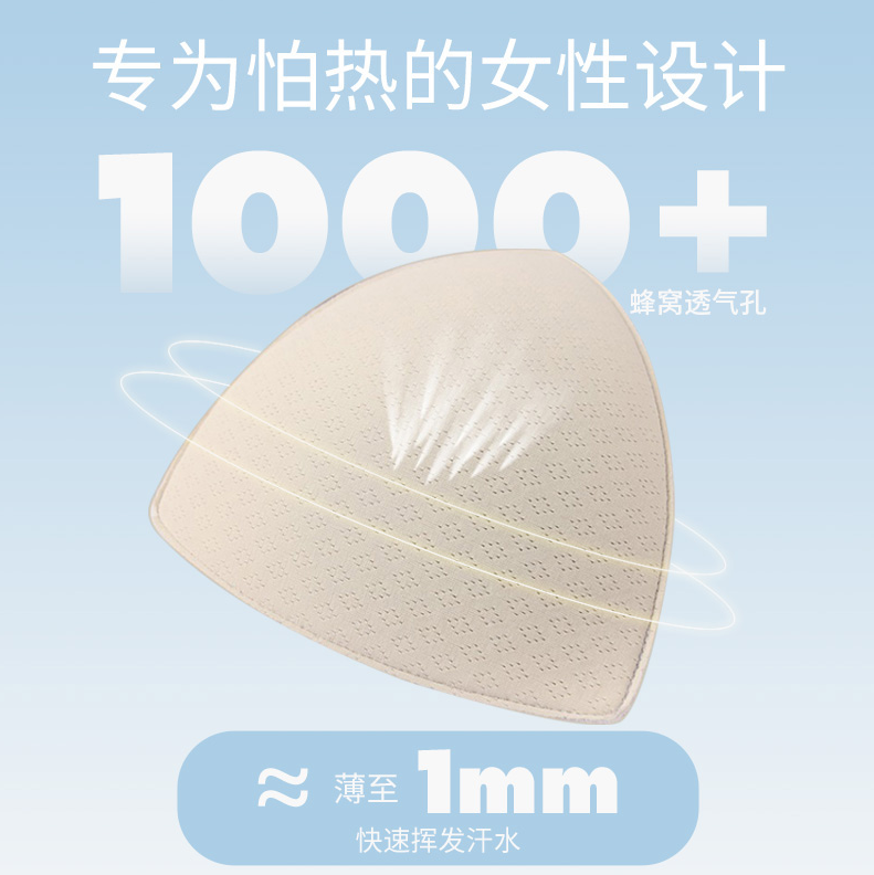 当然,也不用担心会闷热,因为小小一片胸垫上有1000+个透气孔,加强了吸湿排汗,走动多了也不会闷热厚度只有约1mm,还不足一个硬币厚,穿上身隐形无感,而且模杯弧度自然,符合胸型曲线