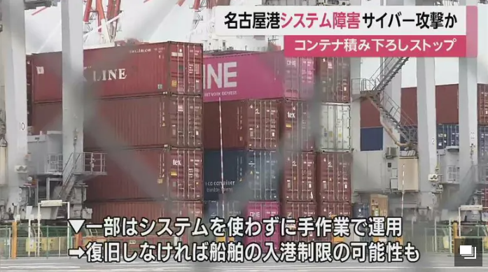 日本媒体FNN报道:“名古屋港运协会消息,7月4日早上6时30分左右,名古屋港集装箱码头发生了系统故障。装卸作业已停止。” 此次事件影响了该港口五个货运终端的计算机系统。