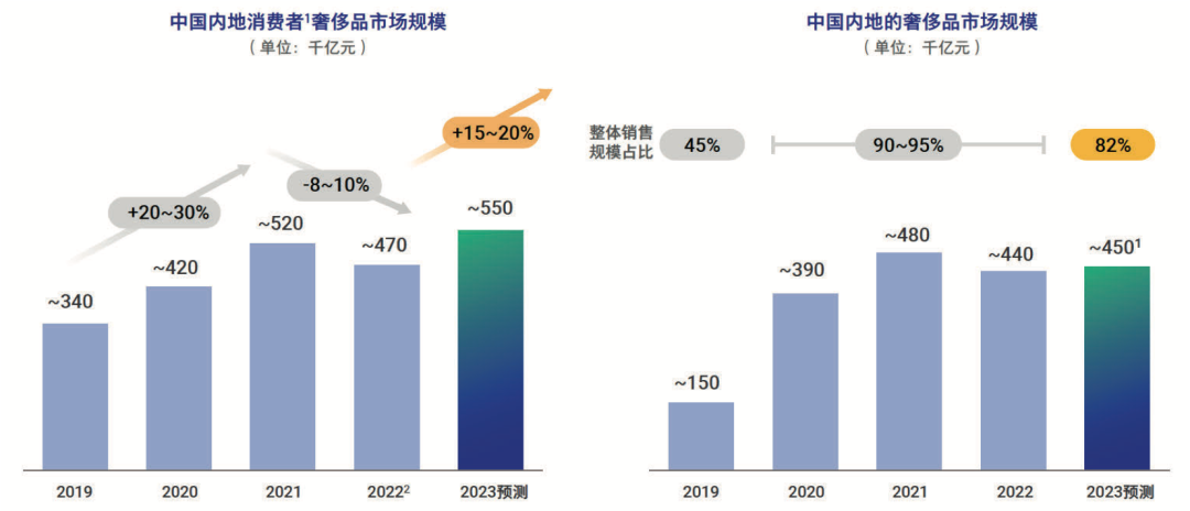 1)2023年中国内地消费者在奢侈品的消费全年预计至5,500亿,同比增速达15-20%。