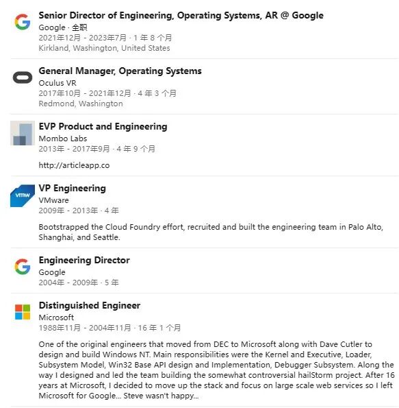随后,Mark Lucovsky 被谷歌聘请加入团队,并担任高级工程总监,负责「为 AR 和 XR 设备开发操作系统和软件平台」。