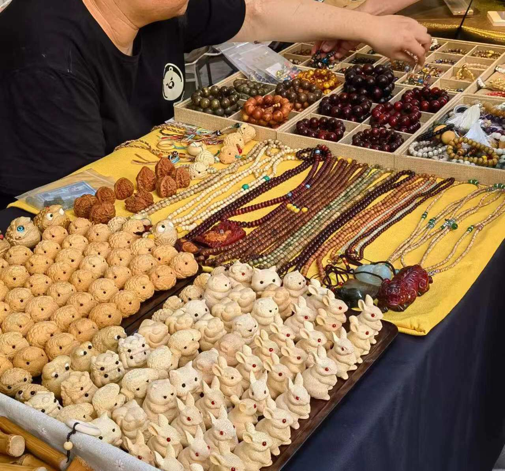 最火的是小吃摊档,旁边的手串摊相对冷清,但白胖的摊主大哥一点儿也不着急,他正斜坐在摊位后,佯作漫不经心地和过客侃着这几天的生意: