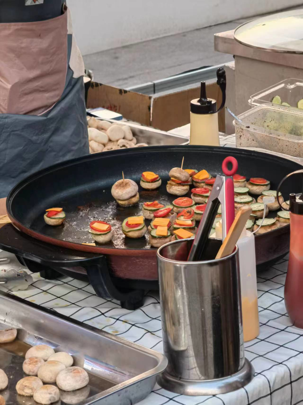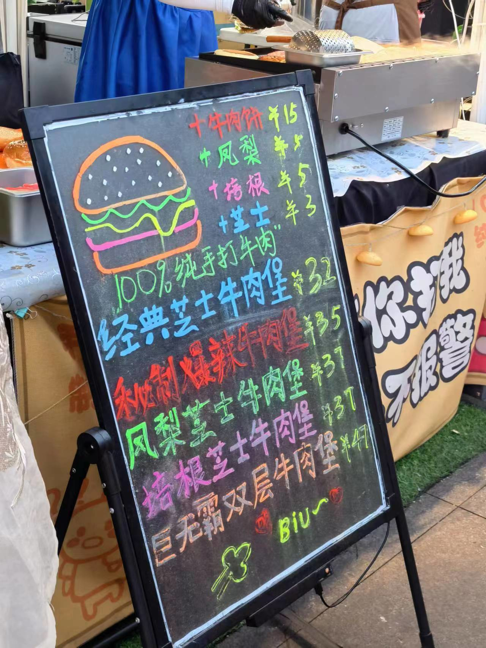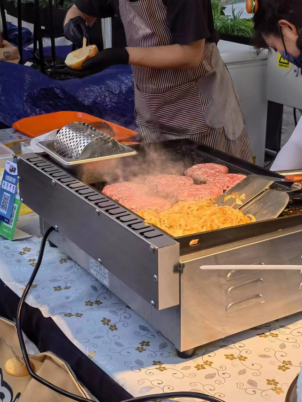 没有臭豆腐、烤肠与铁板鱿鱼,萦绕在摊位区的是牛肉与黄油的复合香气,这是汉堡摊档无声胜有声的吆喝,美式快餐,夹的却是和牛肉饼。