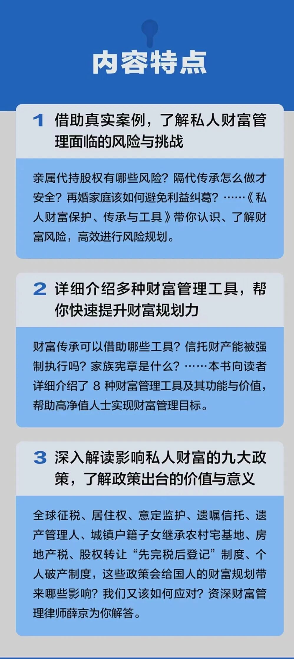 由薛京律师编写的《私人财富保护、传承与工具》已由电子工业出版社正式出版发行(欢迎点击“阅读原文”,跳转购买)。本书是作者从企业财富、财富传承、婚姻财富、财富工具及政策解读五个角度,深入分析私人财富面临的风险问题,以打破大众的法律盲区,为大众提供操作指引。本书借助翔实的司法案例,对资本市场热点问题、与大众密切相关的财富保护及传承问题进入了深入、透彻的分析,并给出规划方案与风险防范措施。同时,作者解读了对大众影响较大的财富领域的相关政策,包括全球征税、居住权、意定监护、遗嘱信托、遗产管理人及房地产税等。