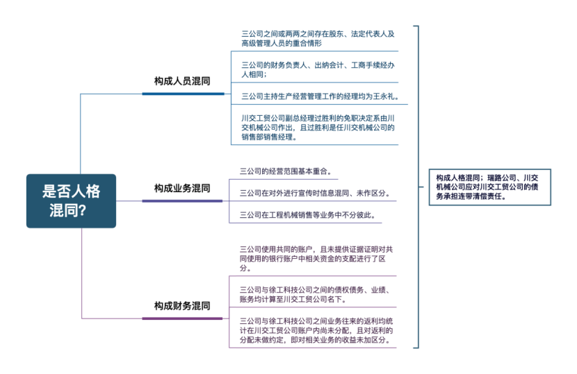 横向否认规则诞生于最高院15号指导案例【(2011)苏商终字第0107号】。在该案中,针对争议焦点——瑞路公司、川交机械公司应否对川交工贸公司的债务承担连带清偿责任,江苏高院的判决思路如下: