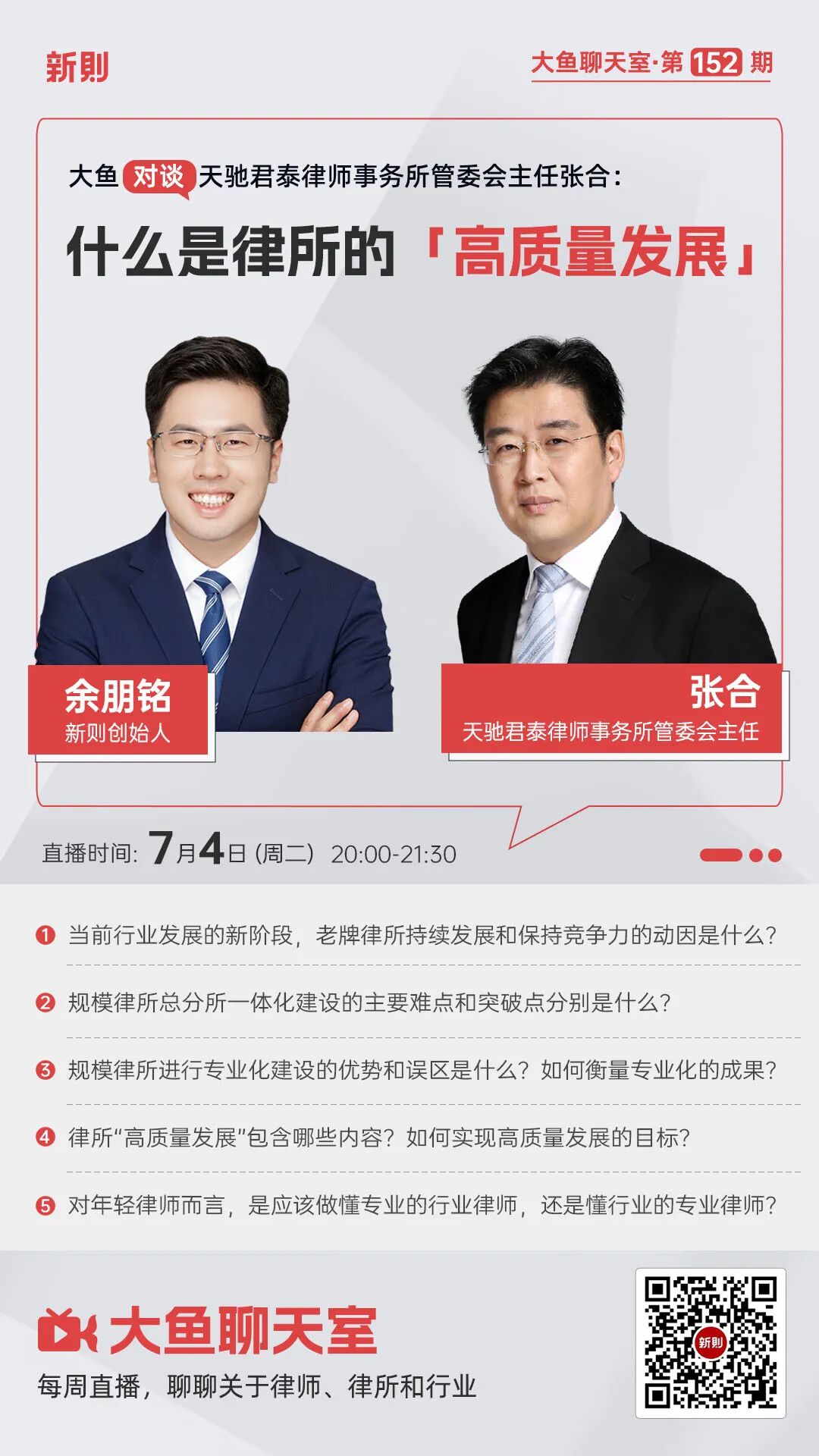 7月4日晚上8点(周二),大鱼对谈天驰君泰律师事务所管委会主任张合,共同探讨「什么是律所的“高质量发展”」。