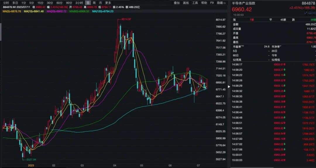半导体行业不仅近期获得了机构的看多,从短期的盘面表现来看,半导体行业也再现冲高的苗头。7月11日单日,半导体行业指数涨超2%,半导体芯片股爆发,海光信息、兆易创新大涨,航天智装20%涨停,香农芯创涨超11%。